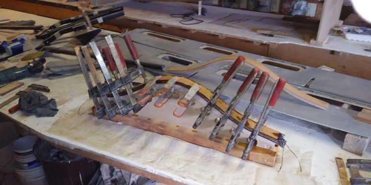 We needed two laminated curved wood pieces (one for the stern to support the rudder post and fittings and the other to stiffen the mid-ship bulkhead which supports the main mast). We made these from 5 thin (1/8”) slats epoxied in layers (with two carbon fibre layers) and clamped on a curved form. The curve mimics the curve of the fore deck and is derived from a mathematical curve called the “bell” curve or normal distribution – a shape that my mathematical self finds highly pleasing.