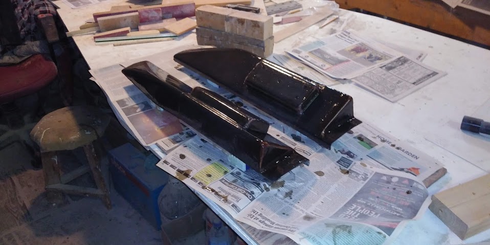 Here you can see the two shapes – the long narrow parts will face forward and are shaped to cut the water cleanly if the boat is heeled while sailing. The raised “pad” on the top is to snugly hold the box part which is bolted to the EZ row unit. Two rope straps with a purchase system of small pulleys will hold it all in place. The idea is that I will row if the wind is light and then as it increases, detach the oar unit and stow it in the stern in specially shaped holders. The black (for now, as it will be painted grey to match the hull colour) “receiver” shape gets left on for sailing.