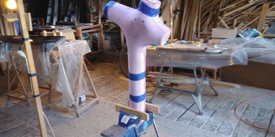 In the pictures below you can see how I first made the holders in rigid foam (insulation material) as one piece that separates into two halves. The second picture shows them taped off for fibreglassing. This will be removed from the form/mold and the foam on the inside shaped to make another fibreglass part that will take the mast and boom. These will then be further shaped and sanded and faired before joining the two parts into one unit that will be coated with multiple layers of special carbon fibre cloth for stiffness to resist the forces on the mast and boom from sailing. The colour scheme is a result of the rolls of electrical tape that I had – pretty jazzy, eh? The shiny tape allows the fibreglass to be removed from the form easily, but just to be sure I waxed and buffed it as well.