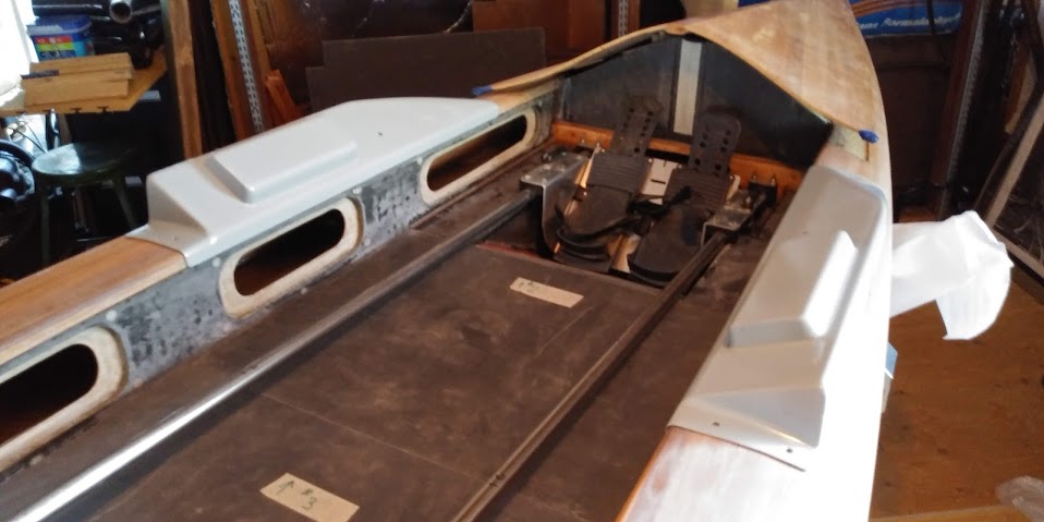 Below you can see some more details: the oval side storage compartments (taped over in earlier pictures) and the rowing seat in place. The floor (black panels with tape on them) slopes downwards to the stern so the water will drain out automatically, however to get the sliding seat a low as possible in the boat we built a “well” for the foot stretchers, and this will probably have to be sponged out the old fashioned way. You can also see the grey supports for the forward rowing system.