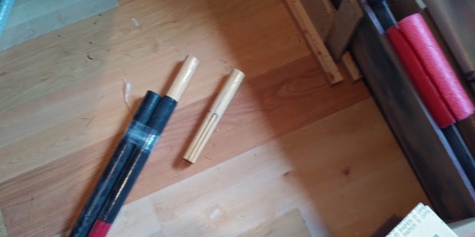 Finally, a bit more about the masts and the mast “partners”: the old windsurfer masts have been reinforced at their base with a carbon fibre sleeve and extra strengthening plugs which I turned on the lathe from sitka spruce are ready to be inserted in each mast and boom. The end of these plugs that is furthest into the mast is drilled out and cut to form long “fingers” (which are not epoxied to the inside of the mast) with the aim of making the transition from solid wood to a more flexible portion which will allow the masts and booms bend more smoothly rather than with an abrupt transition where the wooden plug ends.