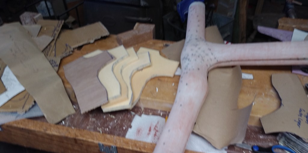 Mast partners are what hold the mast in place, but in this boat there is a bit of a difference: the actual “partner” that holds the mast is bent at an angle to allow the masts to tilt when sailing down wind. I designed and built a version when I was working in Grand Bend but once home I came to realize that they were too heavy… so I am rebuilding them and hope to achieve a good weight savings and that they don’t look quite so clumsy. Then the challenge of supporting them – especially the forward mast – required me to design and build a holder that fits under the deck for the foremast and under the floor for the mainmast. The time-consuming part is building this as a “mock-up” to get the dimensions and angles correct, and then finally building it with ply, foam and carbon fibre.